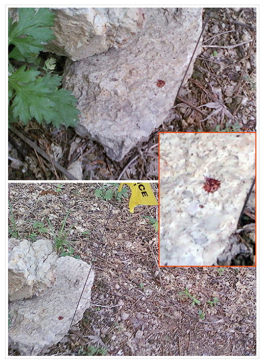 응급실에서 외상환자들 받아볼 때 경험으로 볼 때 혈액 한 방울이 30센티미터 위에서만 떨어져도 좁은 반경을 가진 피 튄 자국이 나타나게 됩니다. 공개된 혈흔은 꼭 바위 바로 위에서 살며시 떨어뜨린 것 같더군요. 마치 그 혈액을 떨어뜨린 사람이 자기 몸에 그 피가 튈까봐 걱정하면서 떨어뜨린 것처럼....