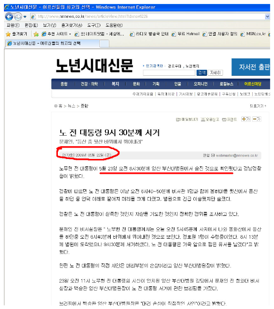 1) 최초 경찰조사에서 유서저장시간 오전 5시 44분 CCTV속 노통과 경호원이 사저를 나선 시간은 5시 38분 유령이 유서작성? 이 사실이 보도되고 네티즌들의 타살의혹과 CCTV 공개요구가 빗발치자 경찰은 CCTV를 공개 그러나 날짜와 시간이 지워져 있었네..