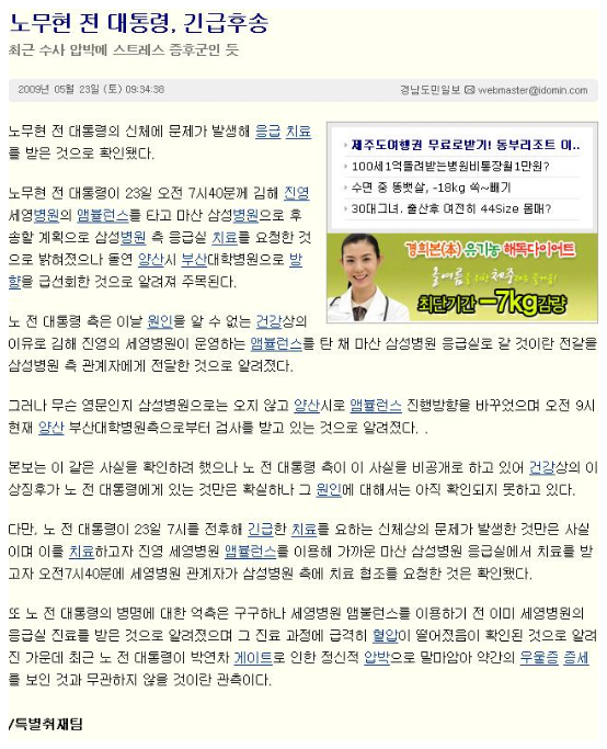 그래서 보내도 된다는 허락을 맡으면 그 때 환자를 보낸다. 당시 노통을 담당했던 의사는 누가 이송을 결정했는지, 자신이 양산부산대병원으로의 이송을 지시했으면 왜 그렇게 지시한 것인지에 대해 공개해야 한다. 또한 전직대통령의 응급상황에 왠 자동차??? 헬기 불렀어야 한다.(의료장비가 탑재된 구급차량이 더 낫지 않으냐는 말이 있는 것 같은데...