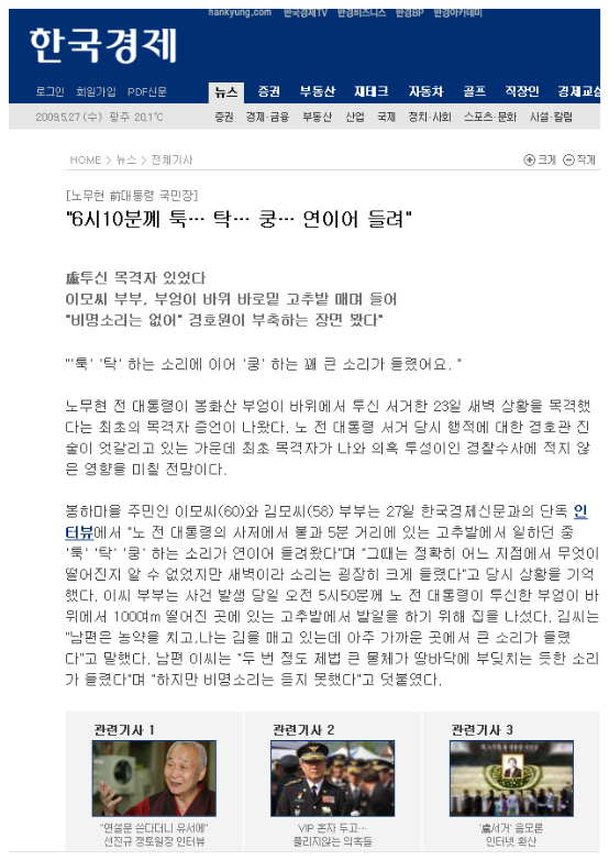 p.s.) 어제 저녁 뉴스를 보니 인근의 회사원이 등산 도중 경호원을 만났었다고 하더군요. 그 회사원에게 노통을 경호한 사람의 사진을 보여 주고 그 때 만난 경호원이 그 사진 속의 사람이 맞는지 확인하게 하십시오. 만약에 두 인물이 다르다면 그 날 산속에는 노통과 경호원 두 사람말고 또 다른 제3의 인물이 있었다는 얘기가 됩니다..